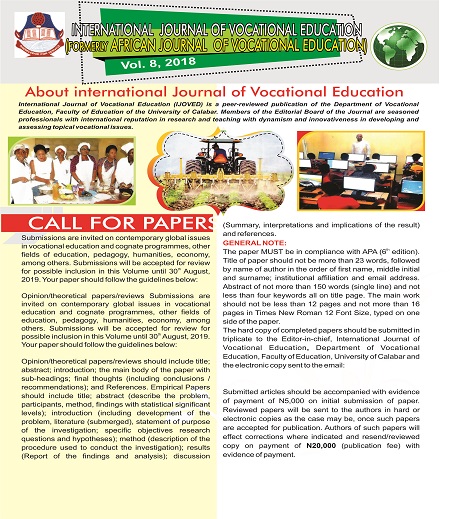 International Journal of Vocational Education (IJORVED), formerly African journal of Vocational Education is a peer-reviewed Publication of the Department of Vocational Education, University of Calabar, Calabar. Members of the Editorial Board of the Journal are seasoned Professionals with International reputation in research and teaching with dynamism and innovativeness in developing and assessing topical issues in vocational and technical education